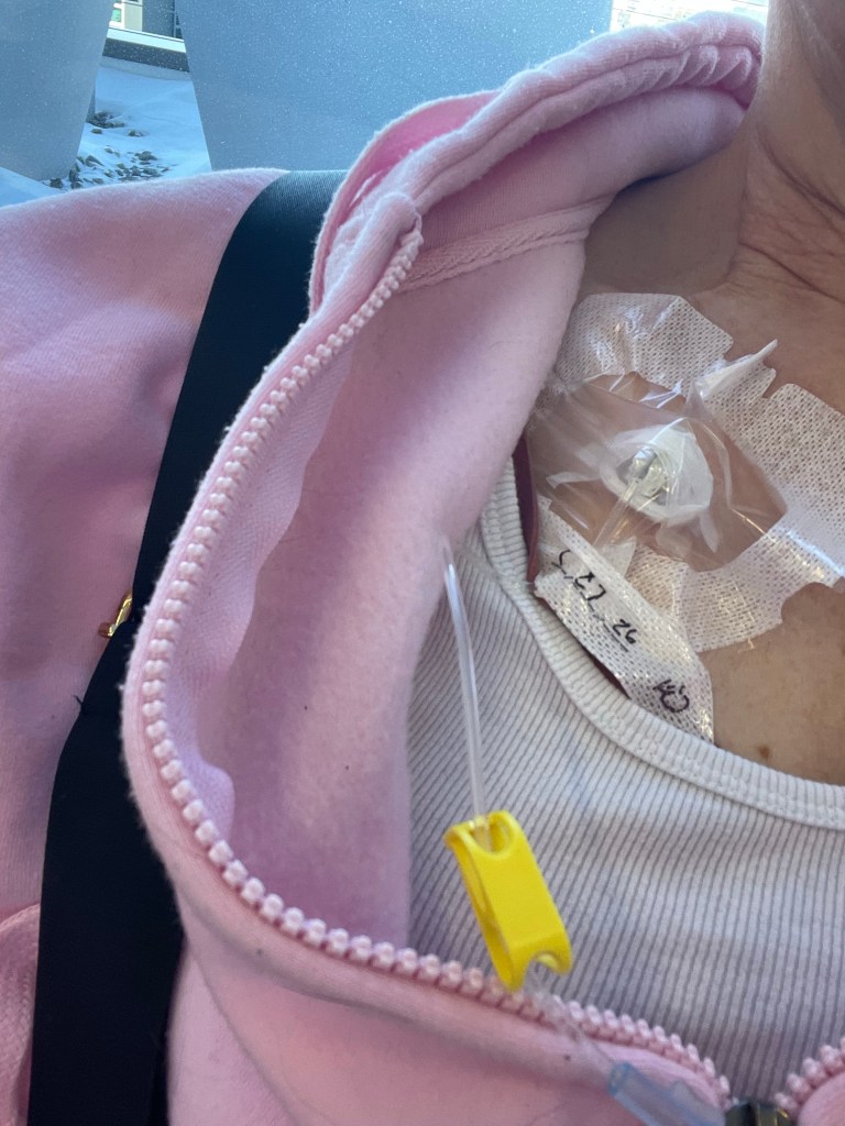 Today was treatment #109. Dave & I left the farm at 6:30 am. We borrowed a vehicle because my daughter and I were in a car accident Sunday. My car took the brunt of it and left us a bit sore and rattled. My digestive system has been challenging lately and today was no exception as Dave maneuvered holiday interstate travel so I could empty my stomach on the side of the road on the way down. He is a keeper.
