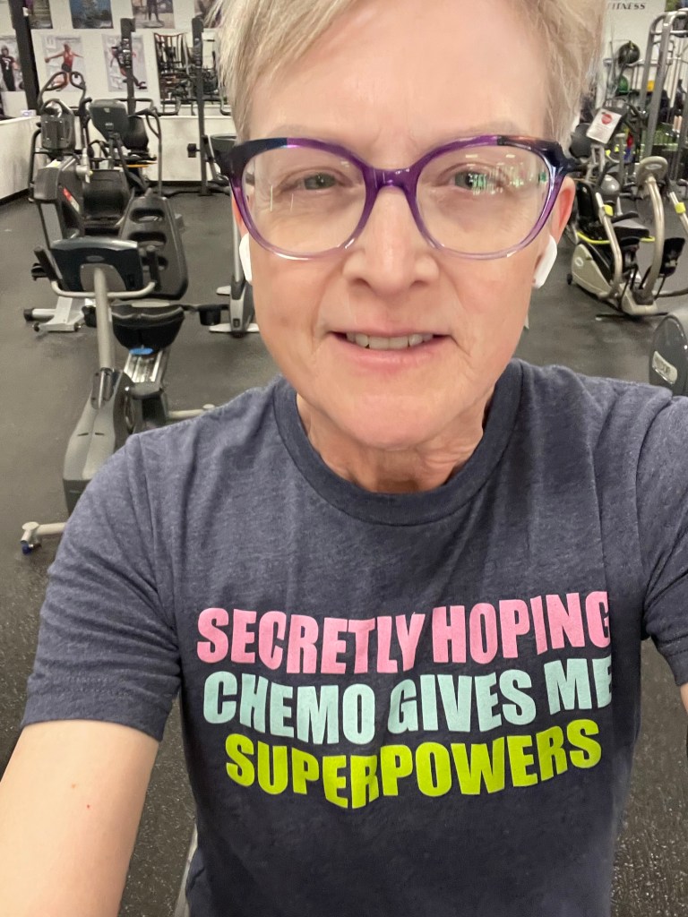 Yesterday started early but I was home in bed by 5 which was heavenly and slept better than I had in many days. I had a support group on zoom this morning. I decided to try walking at the gym and was able to go 20 min at a pace slower than usual. I felt smug. So I decided to walk Madi this evening. It was not a good choice to walk a 90 pound dog the day after treatment. A dog started running toward her and she took the bait. I was not prepared and ended up face planting in the ditch. She came running back immediately after hearing me swear loudly at her and laid down beside me as though she was a caregiver and not a troublemaker. Sometimes I think she recognizes her name as, “God Dammit Madi.” I have some abrasions and I know I will be sore tomorrow, but it could have been worse. Lesson learned.